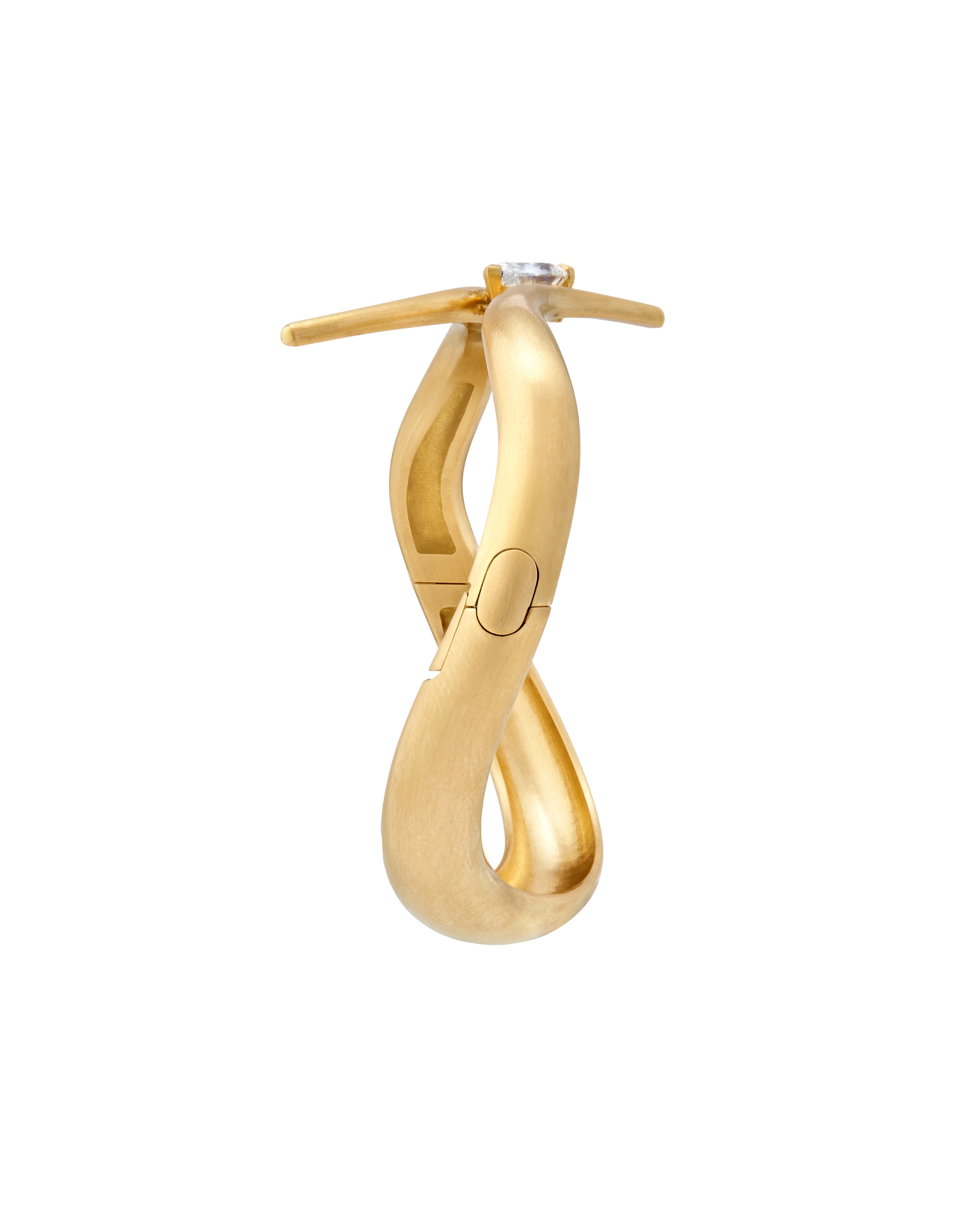 Bracelet ouvrant en or massif sculpté et brossé à la main dessinant une double courbe sinueuse ponctuée d'un diamant.
