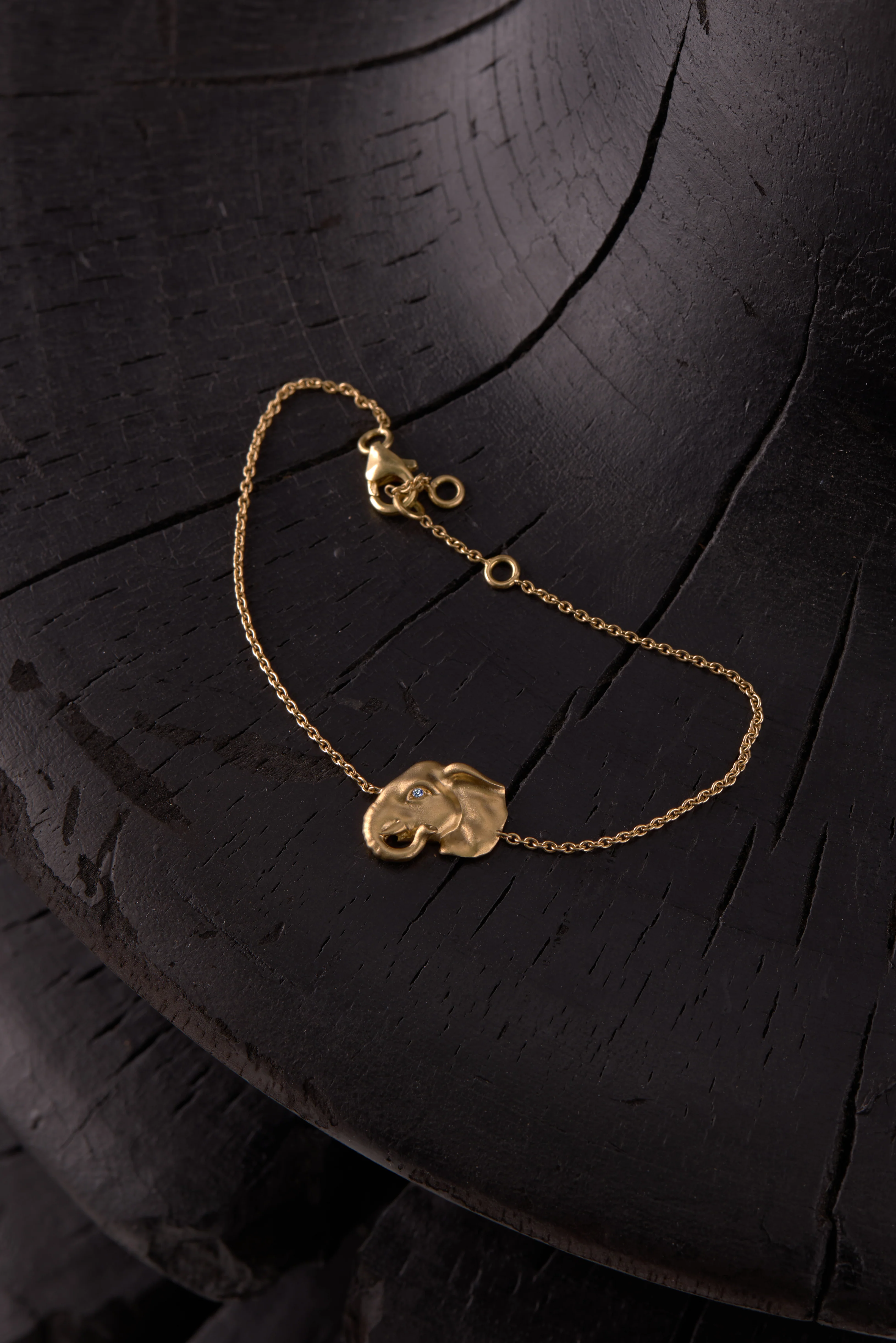 Cette tĂŞte d’élĂ©phant en or sculptĂ©, poli Ă la main et serti d’un diamant symbolise la chance tandis que son diamant Ă©voque l’engagement.Â