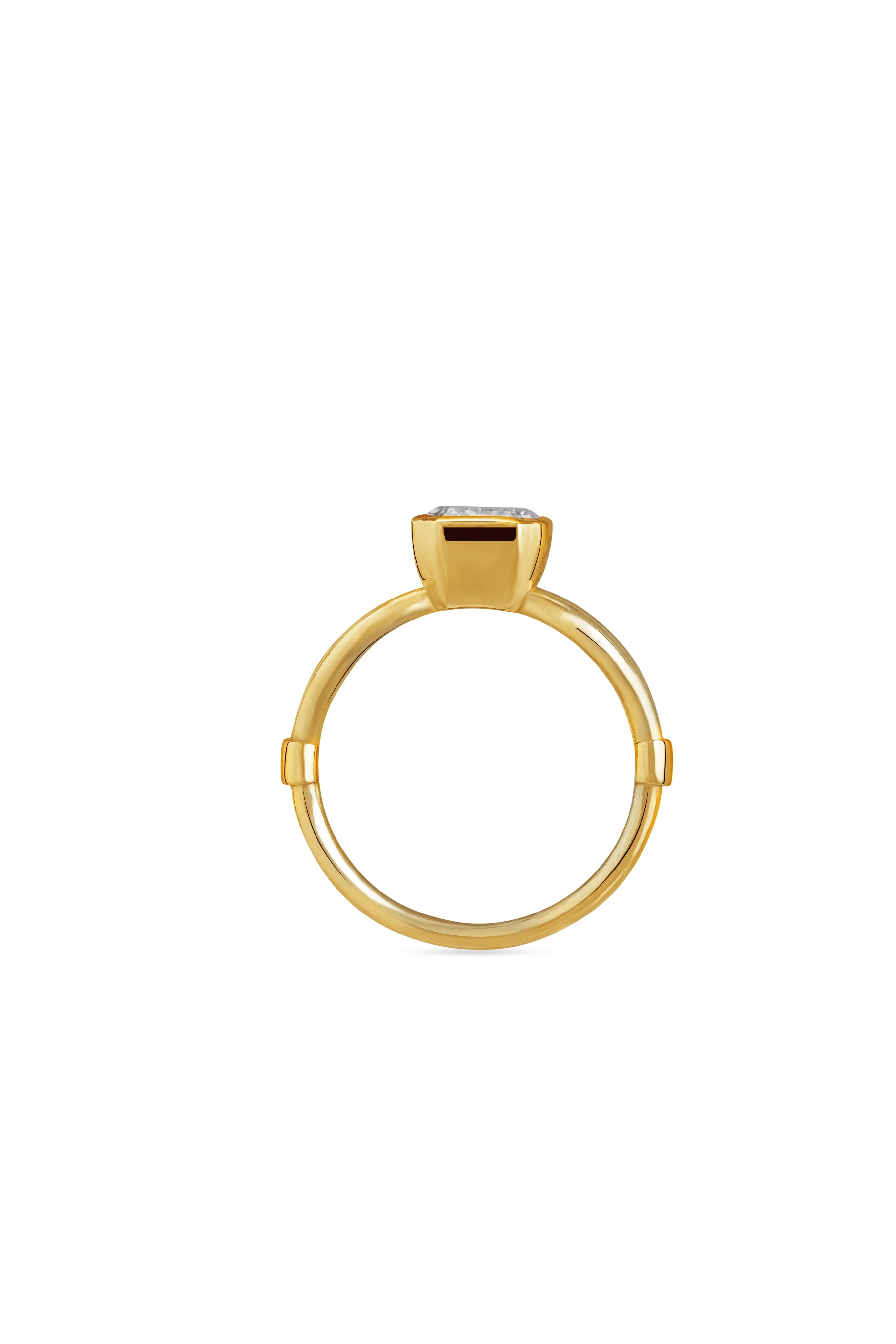 Un fil d’or unique dessinant une boucle éternelle, ponctuée de liens symétriques symbolisant nos piliers du mariage : la Force et l’Unité, serti d’un diamant.
